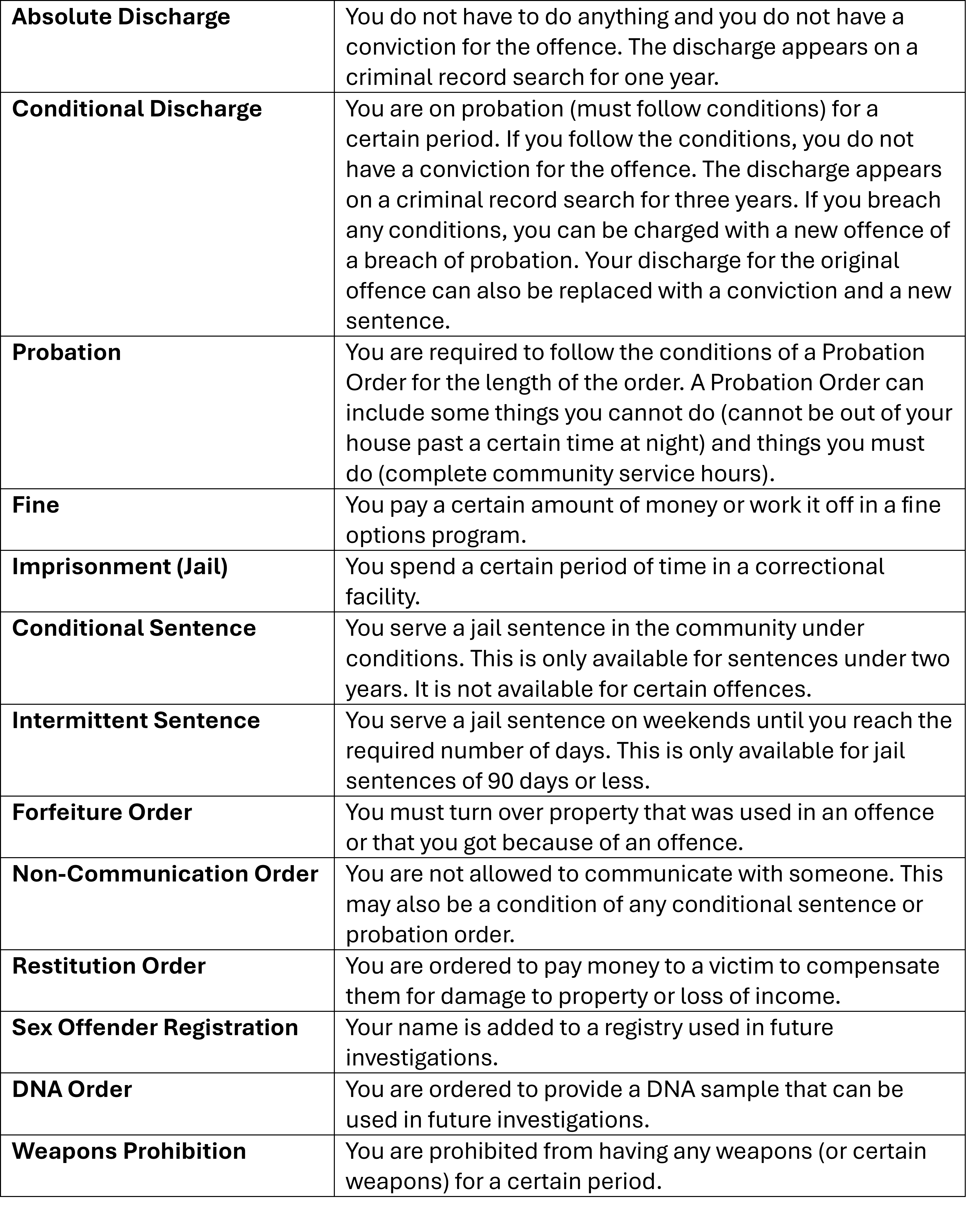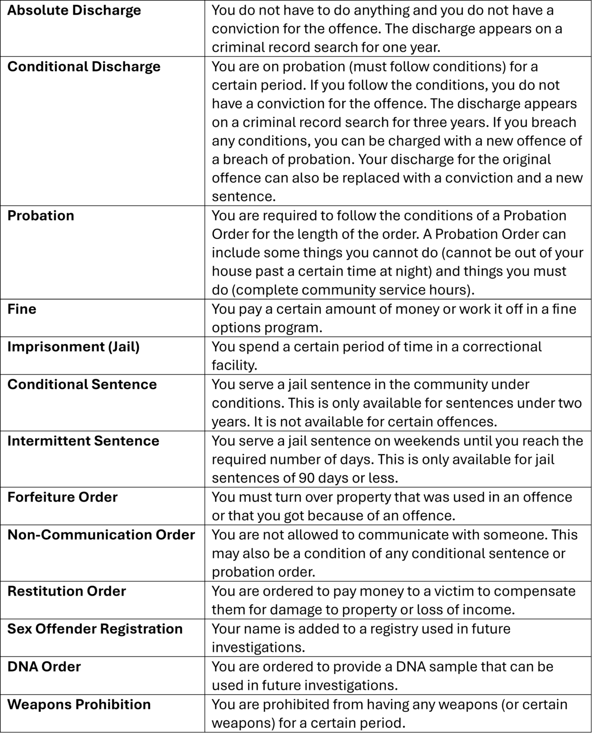 The chart below summarizes the types of sentences possible for criminal offences. Further descriptions of each are given at the bottom of the page.