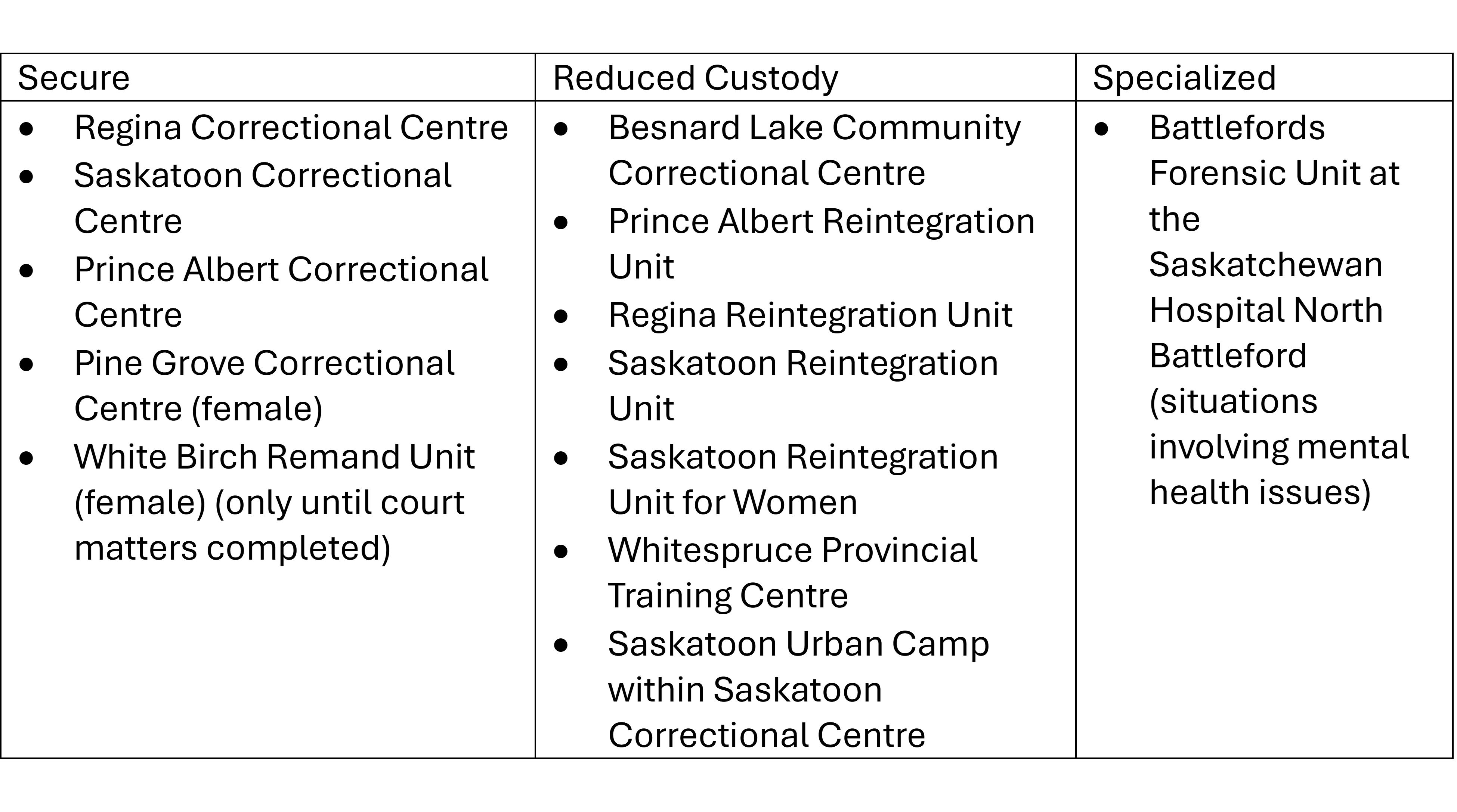 There are fewer options for women who are sentenced to provincial jail time. Pine Grove Correctional Centre is currently the only women's facility in the province. The Saskatoon Reintegration Unit for Women is the only reduced custody option.