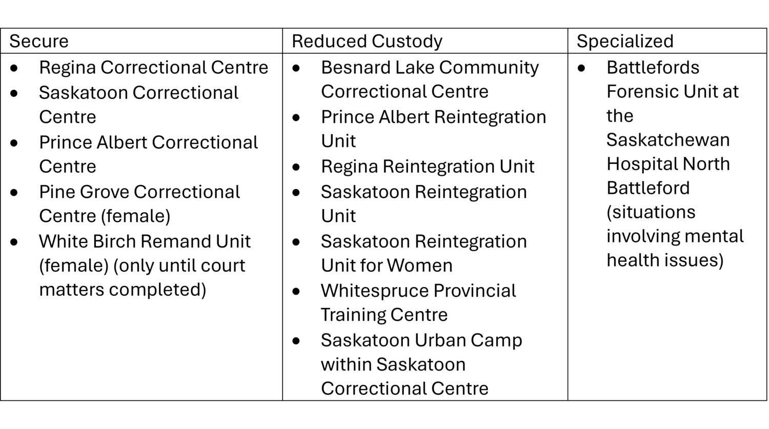 The Saskatchewan Penitentiary is the only federal facility in the province that has all levels of security (maximum, medium, minimum). It is for men only. If you are a woman and do not qualify for a healing lodge, you will likely serve your federal sentence at a regional facility outside of Saskatchewan.